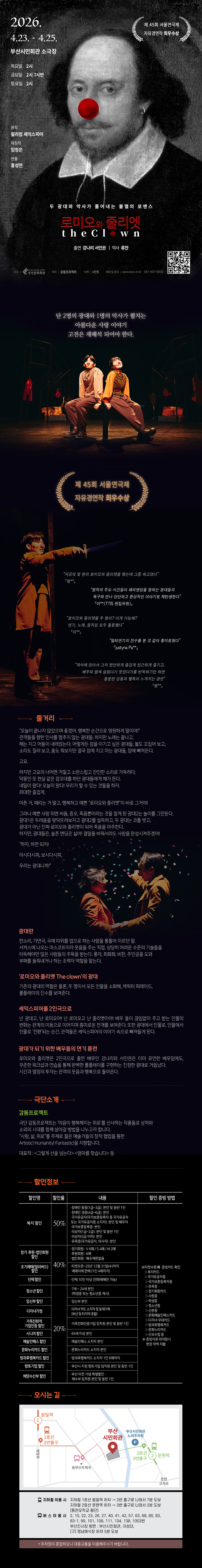 ![로미오와 줄리엣 The Clown [부산] 소개 이미지 1](http://www.kopis.or.kr/upload/pfmIntroImage/PF_PF278267_202602020551102140.jpg)