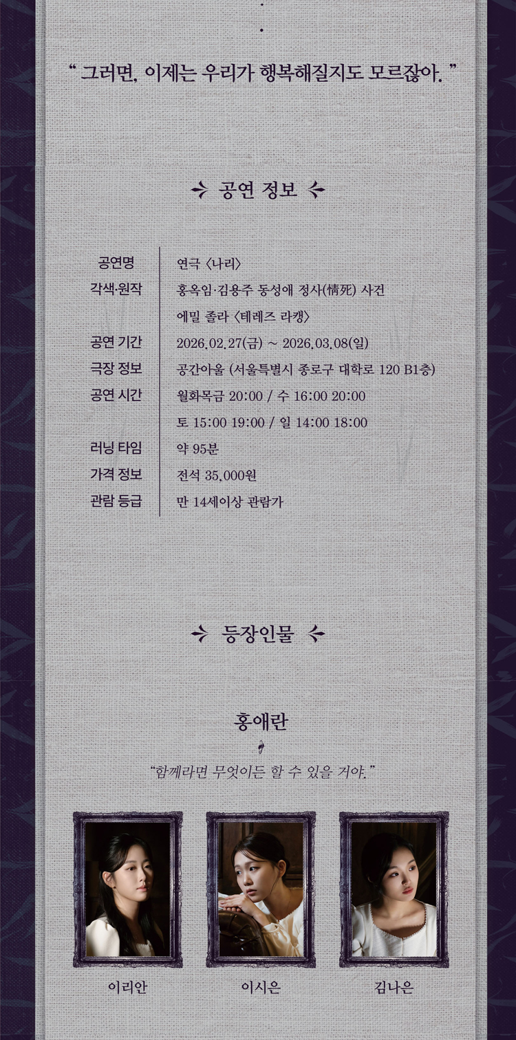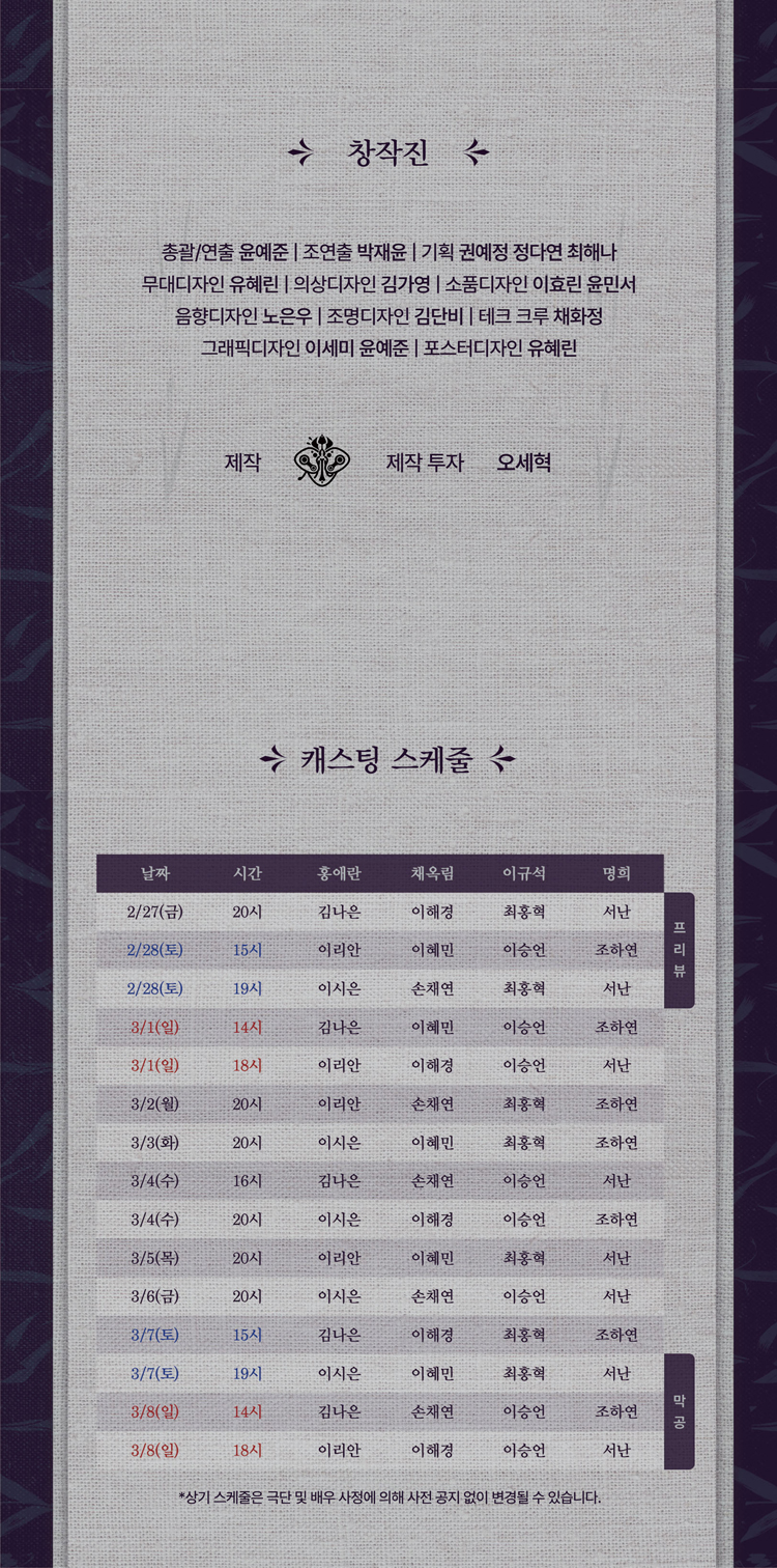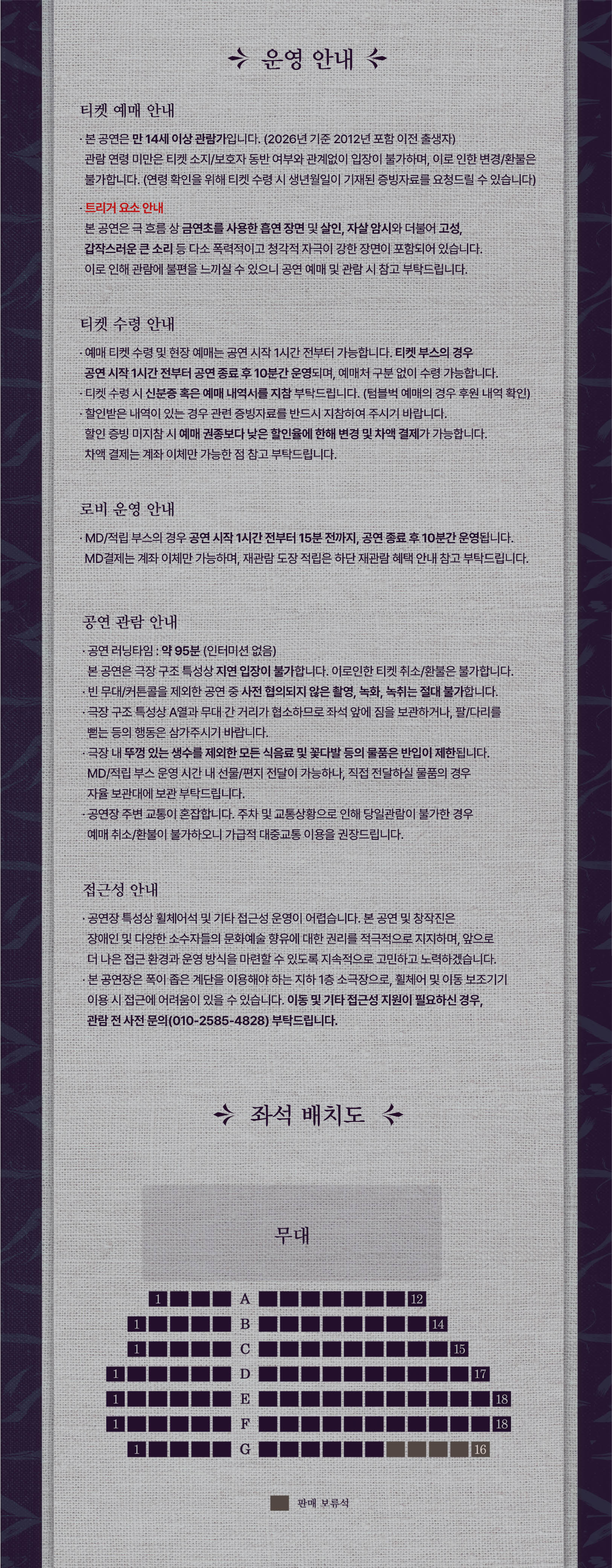 화요일(20:00), 수요일(16:00,20:00), 목요일 ~ 금요일(20:00), 토요일(15:00,19:00), 일요일(14:00,18:00), HOL(20:00)