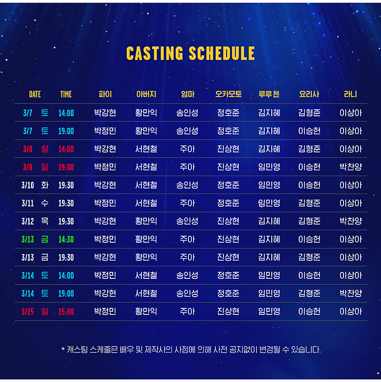 화요일 ~ 목요일(19:30), 금요일(14:30,19:30), 토요일 ~ 일요일(14:00,19:00)