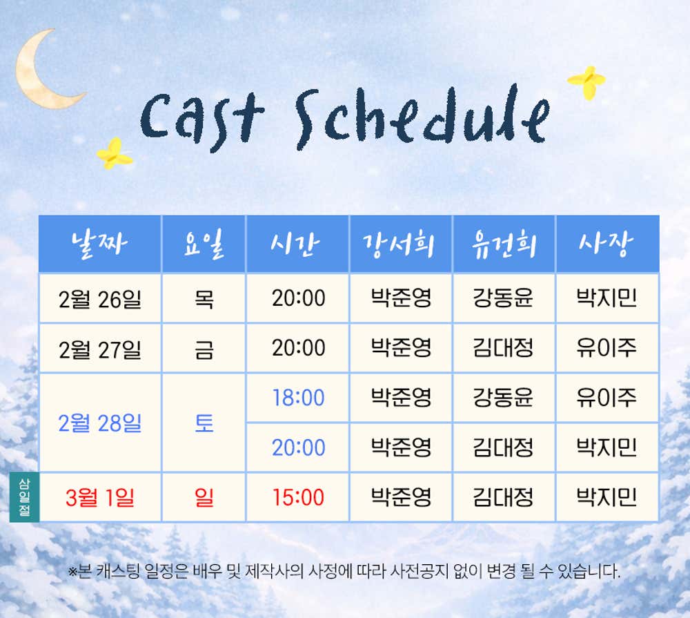 목요일 ~ 금요일(20:00), 토요일(18:00,20:00), 일요일(15:00)