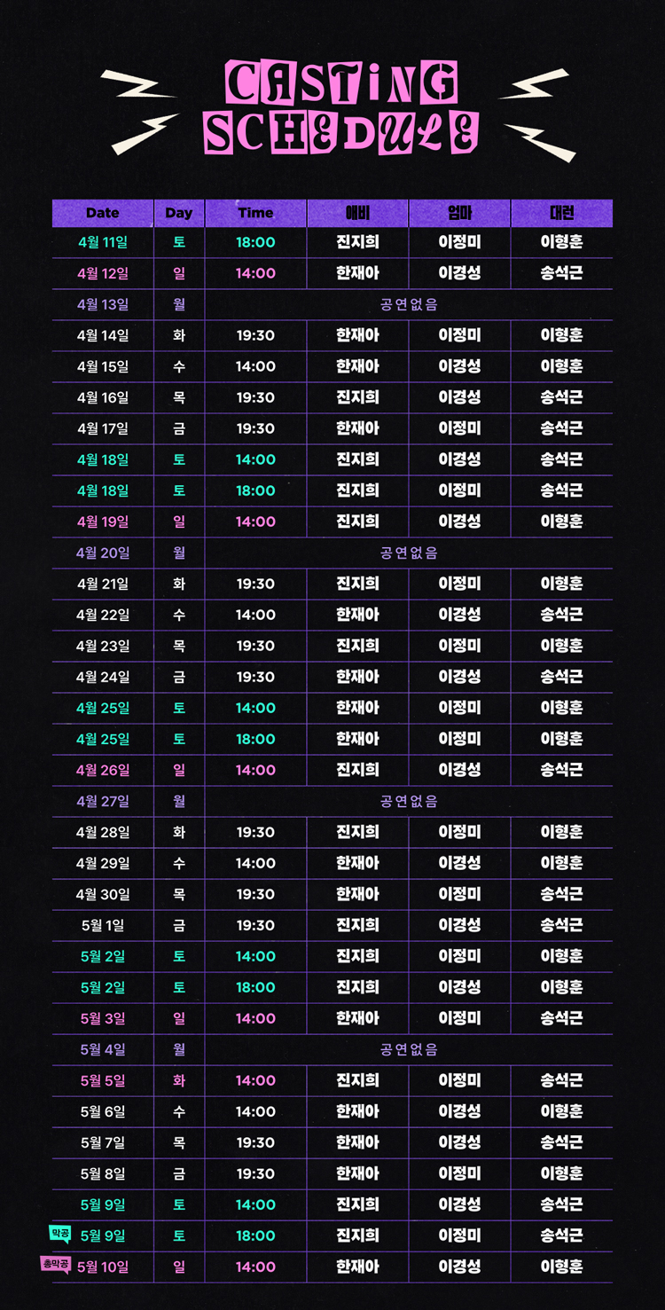 화요일(19:30), 수요일(14:00), 목요일 ~ 금요일(19:30), 토요일(14:00,18:00), 일요일(14:00), HOL(14:00)