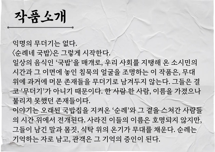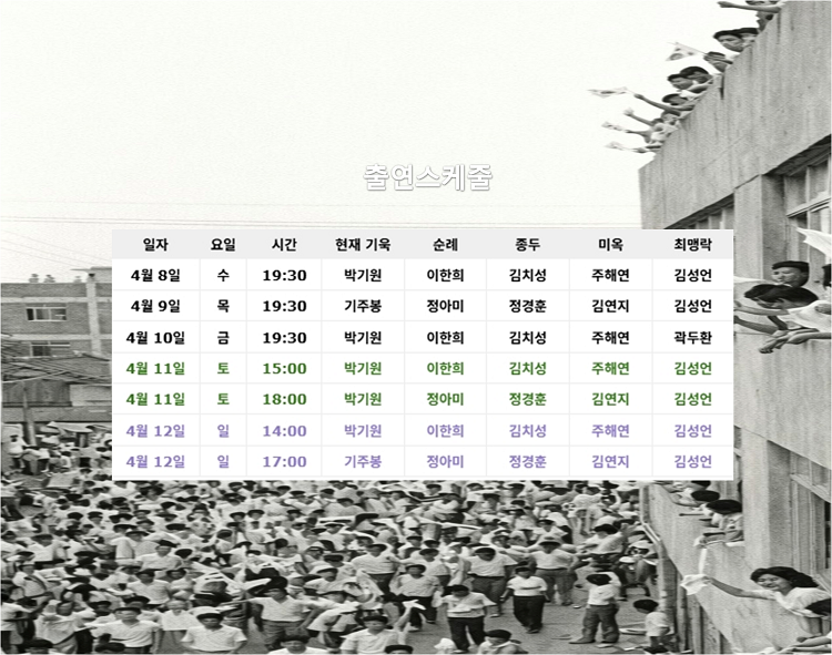 수요일 ~ 금요일(19:30), 토요일(15:00,18:00), 일요일(14:00,17:00)