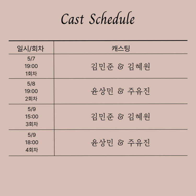 목요일 ~ 금요일(19:00), 토요일(15:00,18:00)