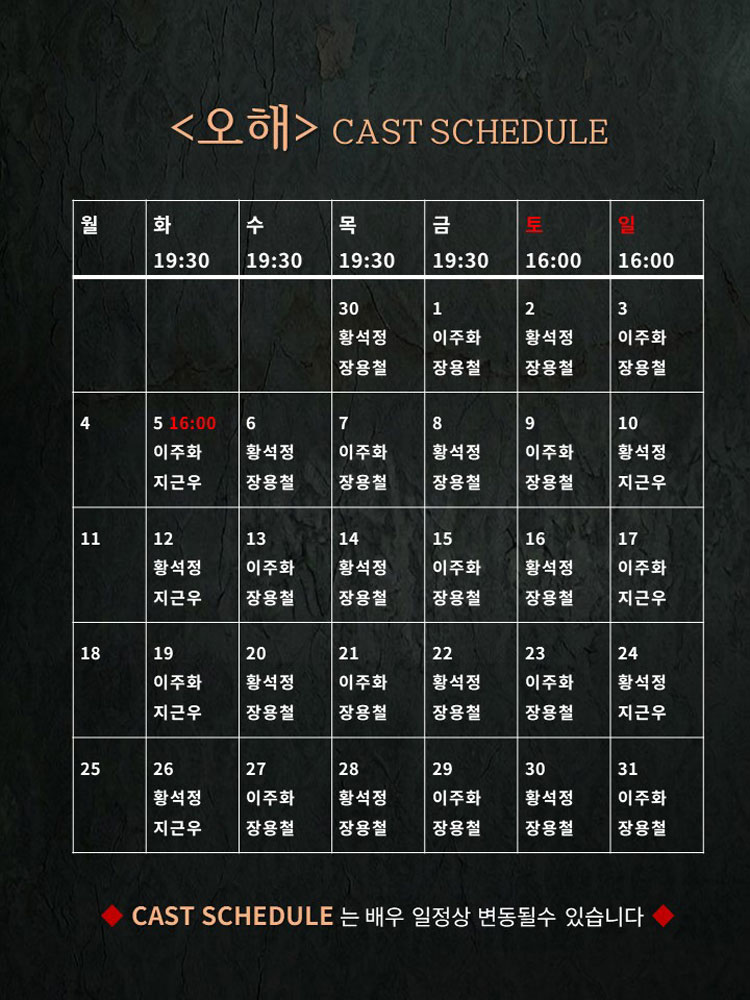 화요일 ~ 금요일(19:30), 토요일 ~ 일요일(16:00), HOL(16:00)