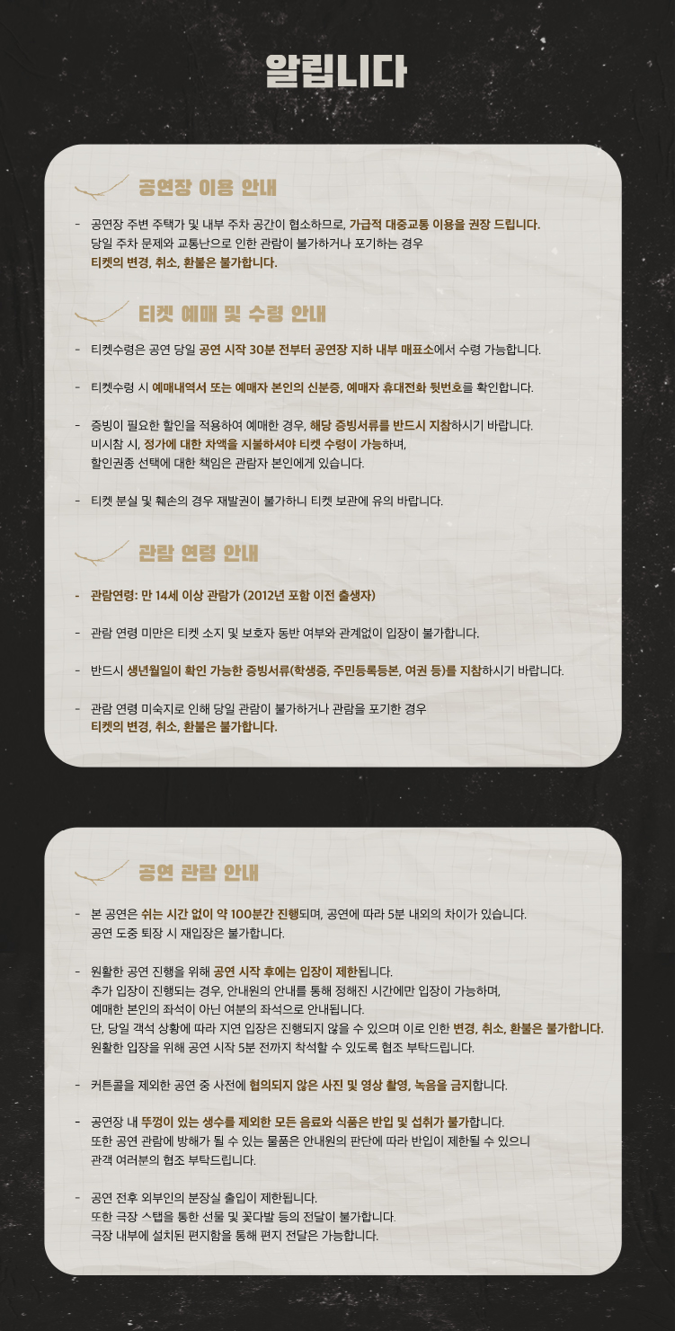 목요일(20:00), 금요일(16:00,20:00), 토요일(15:00,19:00), 일요일(14:00,18:00)